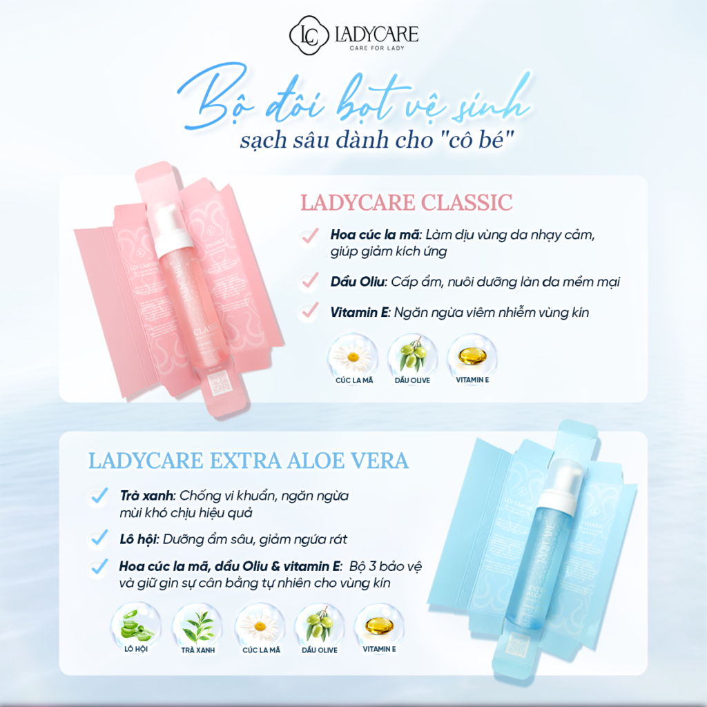 Bọt vệ sinh phụ nữ Ladycare giữ sạch vùng kín, khử mùi hôi, mang đến cảm giác tự tin cho chị em phụ nữ với Bọt rửa phụ khoa Ladycare Classic. Sản phẩm được chiết xuất từ các thành phần tự nhiên, hỗ trợ dưỡng ẩm, làm sạch, cân bằng PH.